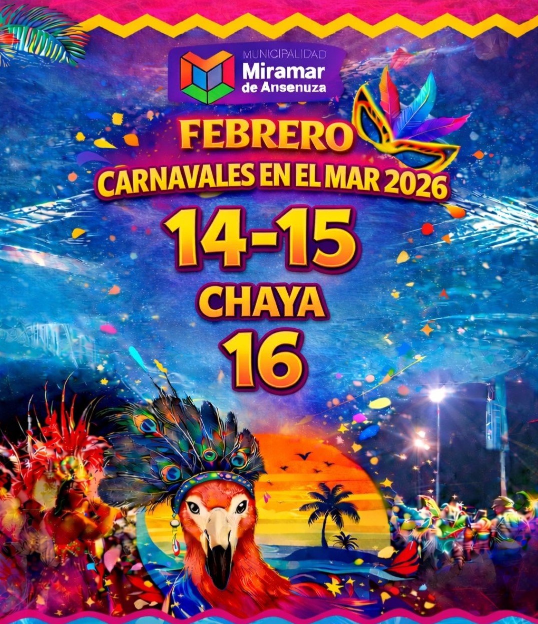 La Municipalidad confirmó que la edición 2026 se desarrollará durante tres noches consecutivas, combinando música, color y propuestas para toda la familia. Las celebraciones centrales tendrán lugar el 14 y 15 de febrero, desde las 21, en la Avenida Costanera – Sector Oeste, mientras que el 16 de febrero la fiesta se trasladará a la Playa Central, donde se realizará una jornada especial de Chaya, sumando el tradicional espíritu festivo a la propuesta carnavalera.