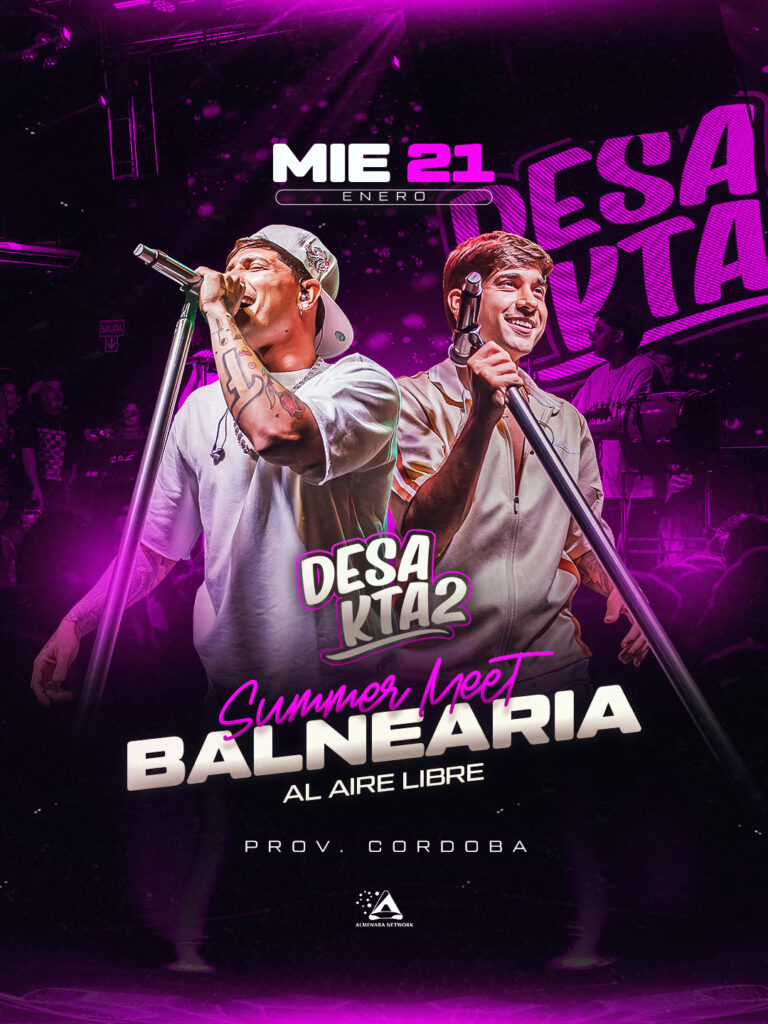 Este miércoles 21 de enero, Balnearia se prepara para vivir una de las noches más potentes del verano con la llegada de Desakta2, la banda que está revolucionando el cuarteto moderno cordobés, en el escenario del ya clásico Summer Meet.
